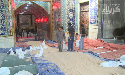 وقال المهندس عبد الحسن محمد في شعبة الاعمال اليدوية في قسم الصيانة التابع للعتبة الحسينية المقدسة لموقع قناة كربلاء الالكتروني ، ان الشعبة باشرت قبل بداية شهر محرم الحرام بفرش أرضية الصحن الحسيني بالكاربت الأحمر واكساء الحائر الداخلي والخارجي بالسواد لاضفاء اجواء حزينة وروحانية ، مضيفا ان قسم الصيانة واستعدادا لشعيرة ركضة طويريج في العاشر من شهر محرم قام بفرش جميع الأبواب بمادة الرمل للمحافظة على سلامة الزائرين عند دخولهم وخروجهم من الصحن الحسيني الشريف.