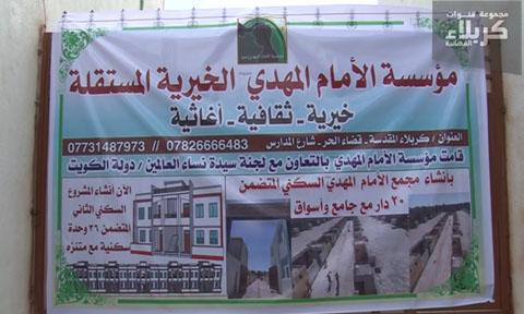 افتتحت مؤسسة الإمام المهدي (عجل الله فرجه الشريف) بالتعاون مع لجنة سيدة نساء العالمين من دولة الكويت مشروع الإمام المهدي لإسكان الإيتام وعوائل الشهداء في محافظة كربلاء المقدسة، وقد وزعت 20 دارا على العوائل المستحقة.