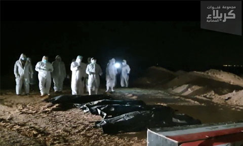 أبطال فرقة الإمام علي (عليه السلام) القتالية يواصلون دفن المتوفين بسبب فايروس كورونا.
