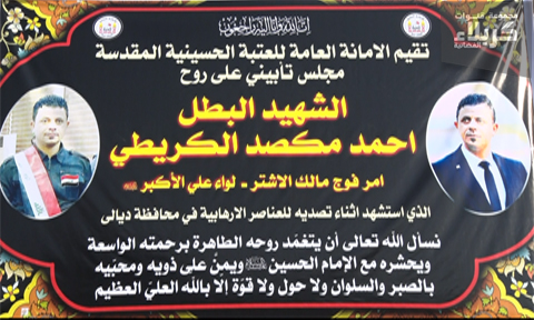 اقامتِ الامانةُ العامةُ للعتبةِ الحسينيةِ المقدسةِ مجلسَ تأبينٍ على روحِ الشهيدِ (احمد مكصد الكريطي) امرِ فوجِ مالكٍ الاشترِ التابعِ للواءِ عليٍ الاكبرِ (عليه السلام) في منطقةِ مابينَ الحرمين ِالشريفينِ الذي استشهدَ اثناءَ تصديهِ للعناصرِ الارهابيةِ في محافظةِ ديالى بحضورِ المتولي الشرعي للعتبةِ الحسينيةِ المقدسةِ سماحةِ الشيخ عبدِ المهدي الكربلائي .