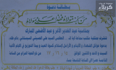 وزعت ممثلية مكتب آية الله العظمى سماحة السيد علي الحسيني السيستاني (دام ظله) بالتعاون مع مجموعة من الأخيار والمتبرعين كسوة عيد الغدير الأغر من خلال سوق خيري لعوائل الشهداء والأيتام والأرامل في قضاء الحسينية بمناسبة حلول عيد الغدير الأغر .