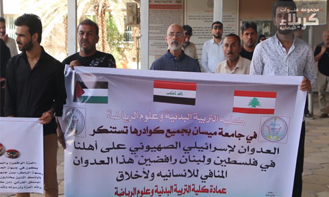 نظمت جامعة ميسان وقفة احتجاجية للتعبير عن استنكارها للعدوان الصهيوني الغاشم على الشعب اللبناني وهو يرتكب مجازر بحقهم، منددة بالهجمات الشرسة التي تستهدف العائلات العزل.